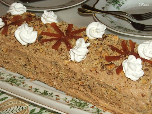 Következett a torta összeállítása. A tésztalap széleit egyenesre vágtam, majd 3 felé vágtam szét. A legalsó lapot megkentem sárgabaracklekvárral, rá egy réteg krémet. Erre jött a középső tészta, szintén lekvárral és krémmel kentem meg. Rátettem a harmadik lapot, majd az egész tortát körben és a tetejét bekentem a megmaradt krémmel. Megszórtam a darált, illetve a durvára vágott dióval, és kapott birsalmasajtból is némi díszítést.