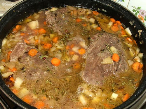 Főzéskor először a hússzeleteket zsíron vagy olajon hirtelen átsütjük, majd kivesszük őket, és a megmaradt zsiradékon üvegesre párolunk egy apró darabokra vágott vöröshagymát, hozzáadjuk a feldarabolt zöldségeket és az almát, együtt pároljuk, sütögetjük még egy kicsit, majd felöntjük vízzel, és adunk hozzá egy leveskockát. Beletesszük az elősütött hússzeleteket is, fűszerezzük tárkonnyal, zúzott fokhagymával, babérral, borókával, a különböző borsokkal, és felöntjük a vörösborral. Adunk hozzá egy pici cukrot vagy mézet, ha kell még egy kis mustárt. Így főzzük együtt - ha kell, pótoljuk az elfőtt vizet - amíg meg nem puhul a hús is, és a zöldségek is.