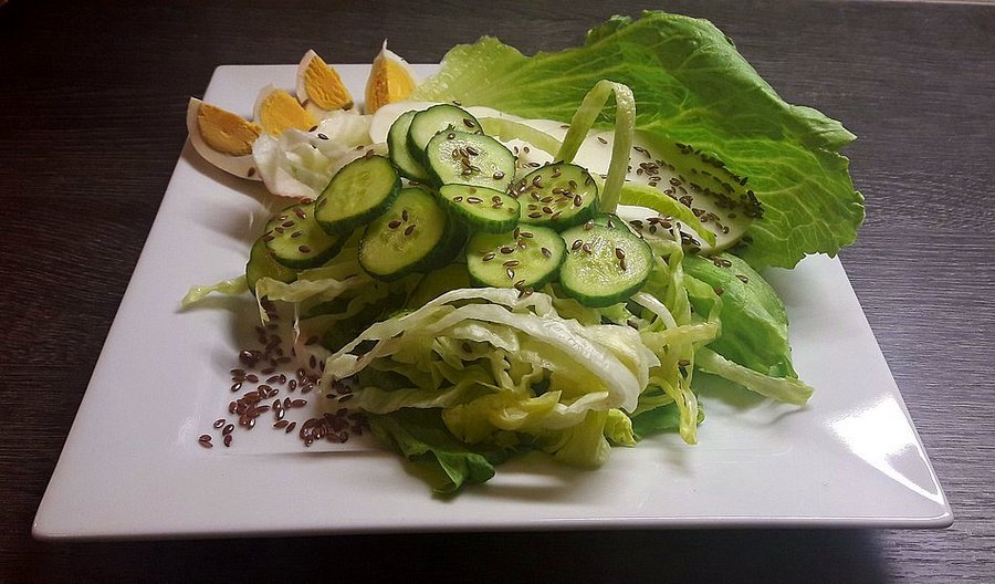 Hozzávalók: tonhalkonzerv, főtt tojás, jégsaláta, vajretek, kígyóuborka, sárgarépa, Himalája só, lenmag.