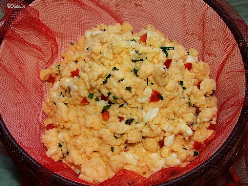 A tojásokat enyhén felvertem, ráöntöttem a tejet, hozzáadtam a sót és a borsot, majd állandó keverés közben felforraltam. Ezután kis lángon folytattam a főzését, szintén kevergetve, míg csomókba nem kezdett összeállni. Mikor teljesen külön vált a savótól, levettem a tűzről, és belekevertem az apróra vágott zöldfűszereket és a kis darabokra vágott piros paprikát.