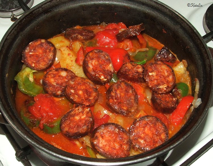 Hozzáadtam a szálasra vágott hagymát, és megdinszteltem. Beletettem a feldarabolt paprikát (szeretem színes paprikákból készíteni), a hasábokra vágott krumplit, pár perc múlva a meghámozott paradicsomot is. Sóztam, megszórtam törött paprikával. Kb. 10-15 perc múlva belekerült a felszeletelt kolbász is - azért csak most, mert a szeletek hamar megfőnek.